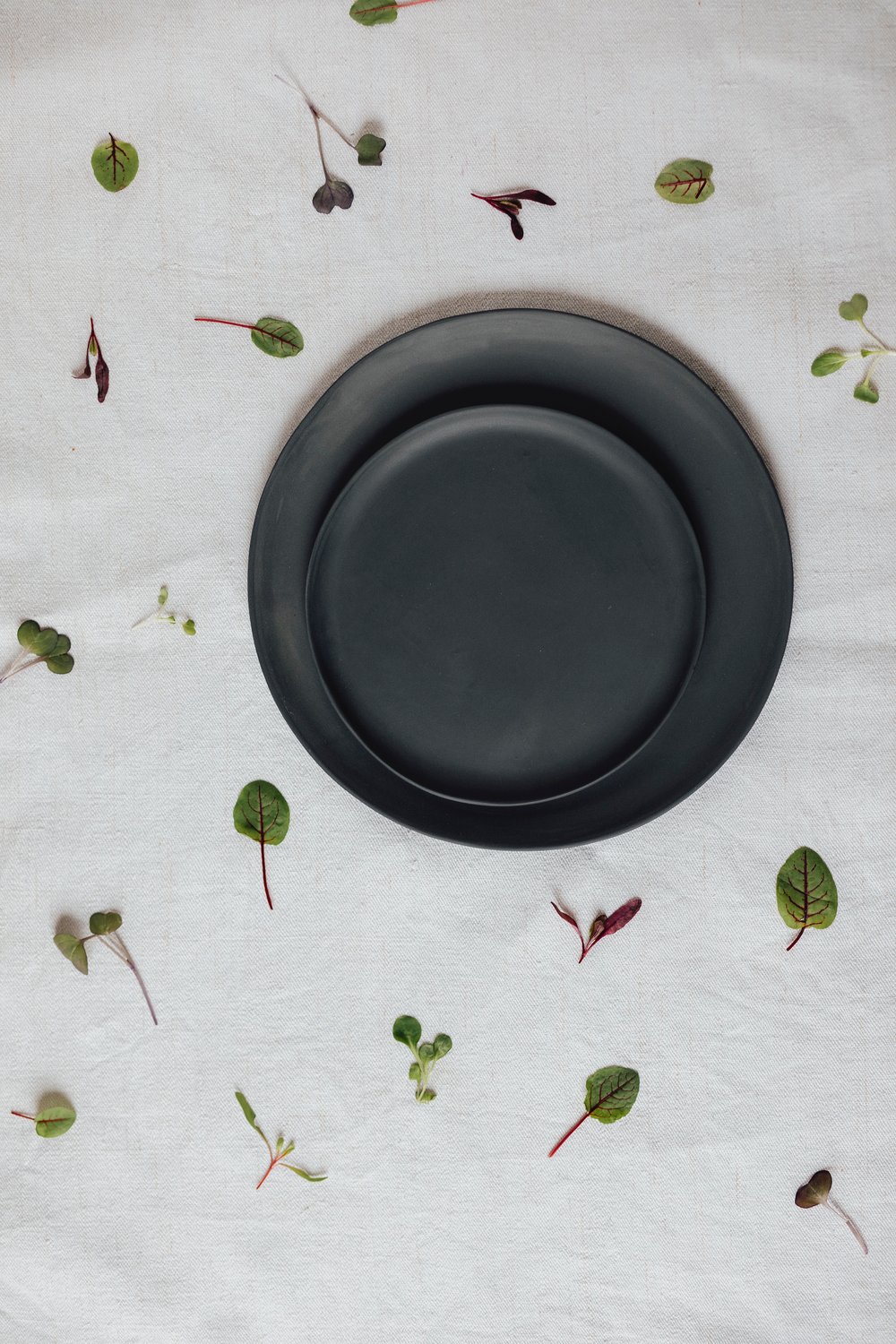 Vor dem Giessen wird das Porzellan mit Farbkörpern eingefärbt. Die Teller sind unglasiert und behalten so ihre matte und steinähnliche Oberfläche. Sie sind in zwei verschiedenen Grössen und in drei verschiedenen Grautönen und in Weiss erhältlich.